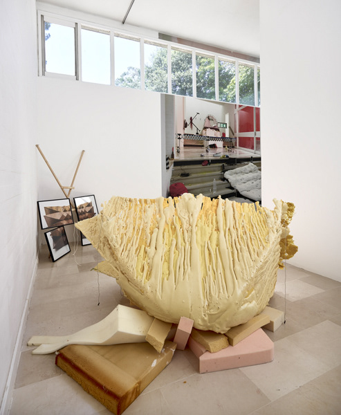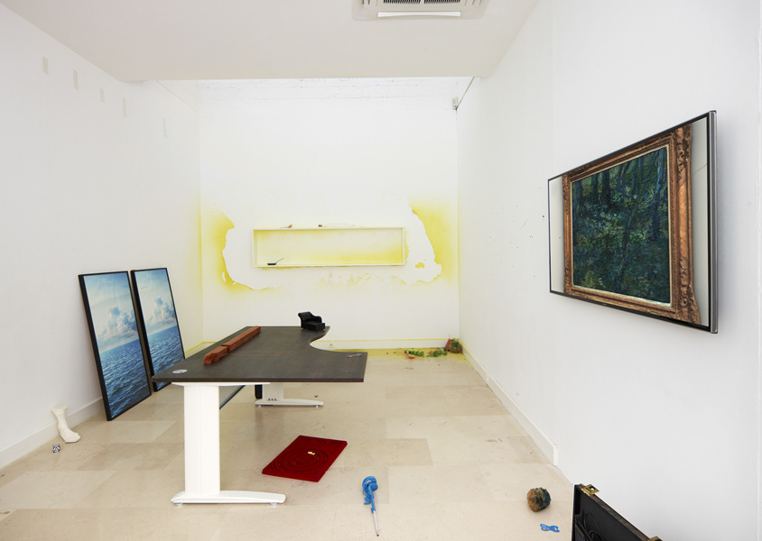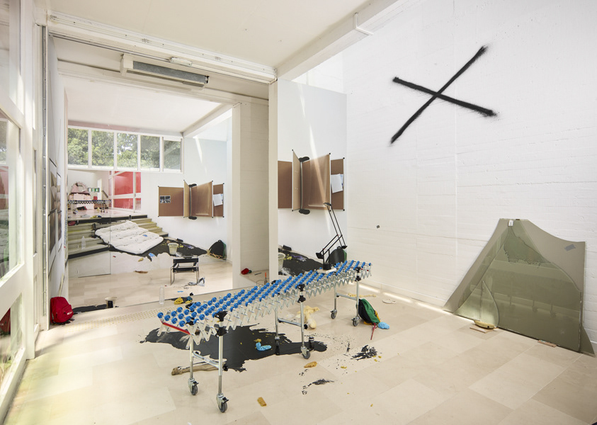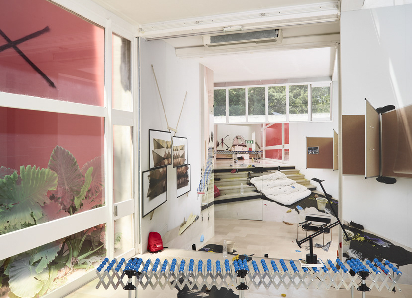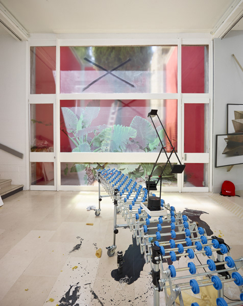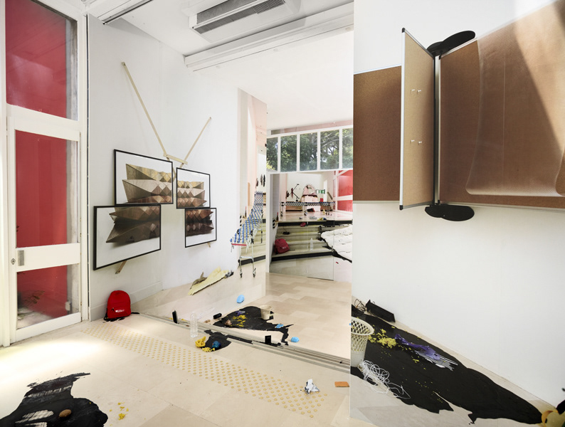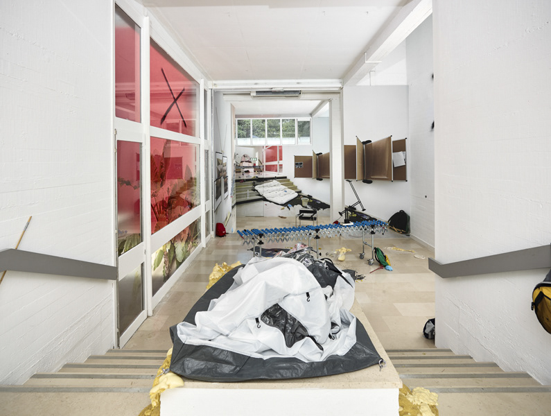 During her resEmmanuelle laine, Villa Arson, exhibition view 2016idency at Villa Arson, Emmanuelle Lainé occupied the galerie du Patio as her working studio. Gradually the space was transformed in an empirical manner, fortuitously or voluntarily, by sedimentation of materials, in an experimental spirit. So the borders disappear between working studio, exhibition space and exterior space. By using photography, as well as for the first time video imagery, we witness a constant « mise en abyme » of the place and the objects into an immersive work of illusion, of decompartmentalization of space which creates a permanently troubled vision.